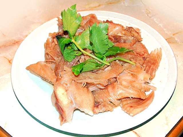 かすべは3cm角くらいに切りA材料に浸けておきます。 1のかすべに卵白をよくまぶし、片栗粉を入れ、よく混ぜなじませます。 170℃くらいの揚げ油で揚げます。 シューマイの皮は縦半分5mm幅くらいに切りきつね色になるくらいまで油で揚げます。 空心菜A 水 150ml A しょうが 薄切り 3枚 かすべは熱湯を回しかけ 、水気を切る。 鍋に A を入れ煮立たせる。 煮立ったらかすべを入れ、中火にする。 落し蓋をして 6分ほど煮ればできあがり。 みかん亭では煮つけは前日に仕込むことにしています。 火から